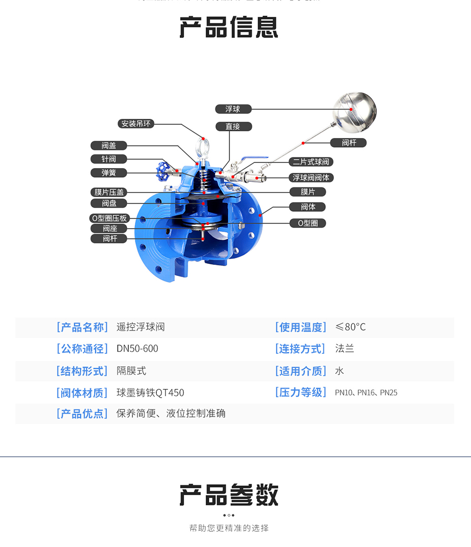 100X遥控浮球阀由主阀、针阀、球阀、浮球阀、微型过滤器等组成水力控制接管系统,调定后,自动控制液面高度。100X遥控浮球阀直接利用液面控制,不需要其它装置和能源,保养简便,液面控制准确度高,不受水压影响,密封可靠。100X遥控浮球阀广泛用于高层建筑、生活区等供水管网系统的水塔、水池等设施的液面控制。